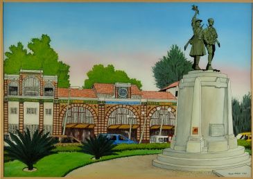 Der wunderschöne 30erjahre-Bahnhof von Dakar mit dem kolonialen Soldatendenkmal davor. Leicht idyllisiert... der Verkehr ist heute so eng, dass man den Bahnhof oft kaum noch sieht.